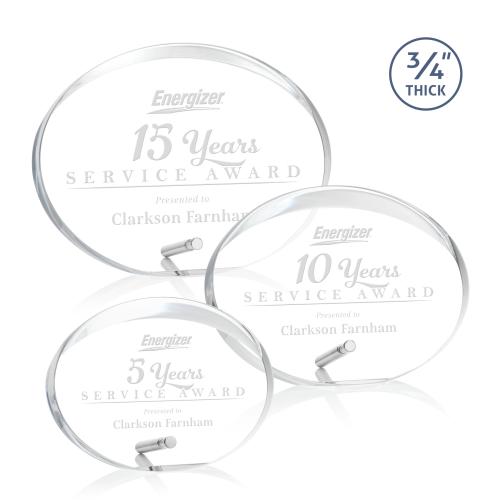 Of the Acrylic Awards, this beautiful Rawlins Award - Silver is a great choice. (AWD7901-S) The Rawlins Acrylic award features a 3/4" thick oval design with a beveled top half and your choice of gold or silver easel pin. A budget-busting award that's perfect for recognizing an exceptional achievement or momentous milestone.