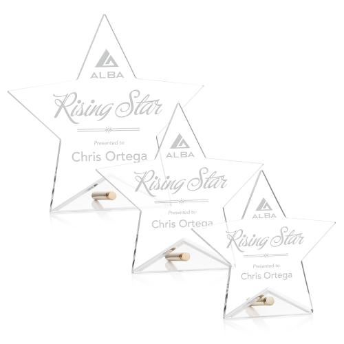 Of the Acrylic Awards, this beautiful Polaris Star Award - Gold is a great choice. (AWD7821-G) The Polaris Star Award features a beveled acrylic star, perched upright with a gold or silver easel pin. The Polaris series of awards are great budget-busting options for recognizing an exceptional employee or a corporate milestone.