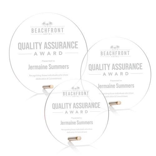 Of the Acrylic Awards, this beautiful Polaris Circle Award - Gold is a great choice. (AWD7751-G) The Polaris Circle Award features a beveled acrylic circle with a clipped bottom that is held upright with a gold or silver easel pin. The Polaris series of awards are great budget-busting options for recognizing an exceptional employee or a corporate milestone.