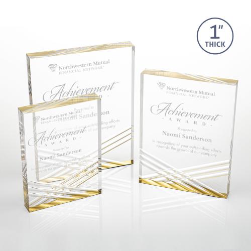 Of the Acrylic Awards, this beautiful Chestham Award - Gold is a great choice. (AWD2051-G) The Chestham Acrylic Award is a striking monument of achievement recognition. A thick freestanding Acrylic tombstone with crisscrossing grooves that reflect a beam of gold from the base.