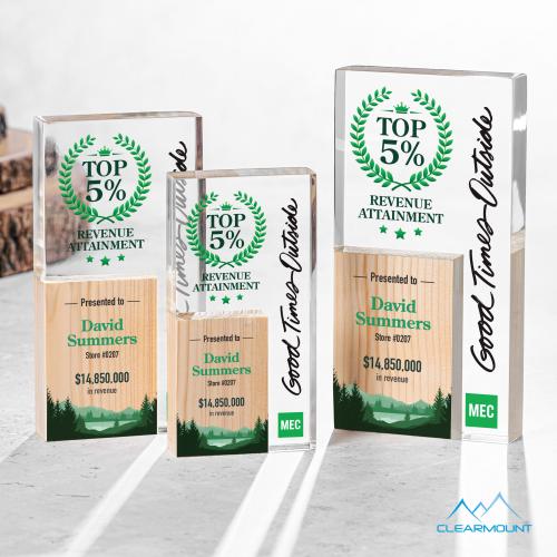 Of the Acrylic Awards, this beautiful Jardin VividPrint™ Award is a great choice. (ARV-JAR1) The Jardin VividPrint Award is a masterpiece that seamlessly combines modern aesthetics with the timeless allure of natural wood. This captivating recognition piece features a sleek acrylic design accented with a distinctive wooden rectangle nestled in the bottom corner, creating a visually striking and harmonious composition. Take your artwork to new heights with full-color VividPrint.
