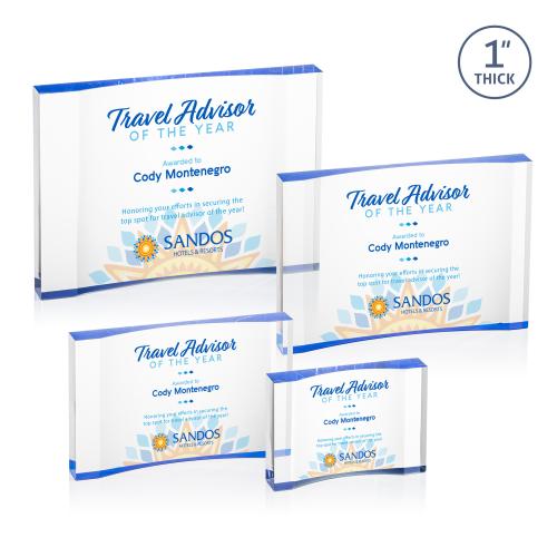Of the Acrylic Awards, this beautiful Langworth VividPrint™ Award - Blue is a great choice. (AWDV2651-L) The freestanding acrylic Langworth VividPrint Award is a stunning, thick accolade featuring a reflective sapphire bottom that radiates a brilliant blue hue throughout the piece. Its unique inward curve provides a sophisticated space for your personalized words of recognition. This award is the perfect way to honor exceptional achievements in any industry with elegance and distinction. Take your artwork to new heights with full-color VividPrint!