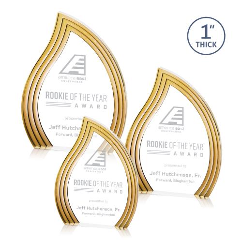 Of the Acrylic Awards, this beautiful Tidworth Blaze Award - Gold is a great choice. (AWD20191-D) The Tidworth Award is a striking freestanding acrylic piece designed in a graceful flame-inspired shape that symbolizes energy and achievement. Its clear acrylic center is framed by bold gold accents, creating a vibrant contrast that enhances its modern elegance. With its flowing curves and brilliant finish, this award is a standout choice for honoring excellence. Available in clear, ruby, sapphire, emerald and gold.