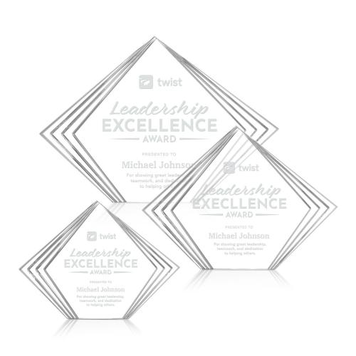 Of the Acrylic Awards, this beautiful Crawford Award - Clear is a great choice. (AWD2331) The Crawford Award is a sleek freestanding acrylic recognition piece featuring a modern diamond-shaped design with layered side accents that create depth and visual interest. Crafted from clear, high-quality acrylic, it offers a generous decorating area perfect for full-color graphics, logos, or personalized messages. Contemporary and versatile, the Crawford Award delivers a bold, eye-catching presentation ideal for celebrating excellence, achievement, and standout performance.