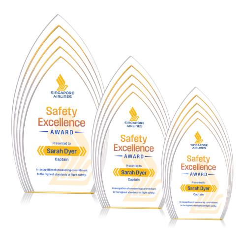 Of the Acrylic Awards, this beautiful Turello VividPrint™ Award - Gold is a great choice. (AWDV2312-D) The Turello Acrylic VividPrint Award is a sleek, freestanding recognition piece designed to make a bold statement. Its modern, layered silhouette features a vibrant color accent at the base that beautifully reflects upward, casting a subtle glow throughout the entire award. Available in gold, sapphire, and clear, the Turello delivers a premium, contemporary aesthetic perfect for honoring excellence at any level. Bring your artwork to life with full-color VividPrint!