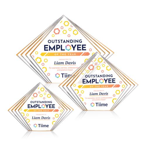 Of the Acrylic Awards, this beautiful Crawford VividPrint™ Award - Gold is a great choice. (AWDV2331-D) The Crawford VividPrint Award is a sleek freestanding acrylic recognition piece featuring a modern diamond-shaped design with layered side accents that create depth and visual interest. Crafted from clear, high-quality acrylic, it offers a generous decorating area perfect for full-color graphics, logos, or personalized messages. Contemporary and versatile, the Crawford Award delivers a bold, eye-catching presentation ideal for celebrating excellence, achievement, and standout performance. Bring your artwork to life with full-color VividPrint!