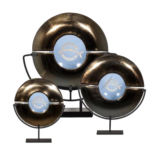 Of the Art Glass Awards, this beautiful Unity Award - Blue is a great choice. (4096.19-B) The Unity is a uniquely crafted award consisting of two metallic gold curved half plates held together with a backer plate curved in watery blue. This dramatic collection is displayed on black iron stands which ship separately for safe arrival. Also available in apple green and ruby red. 1 Colorfill Included