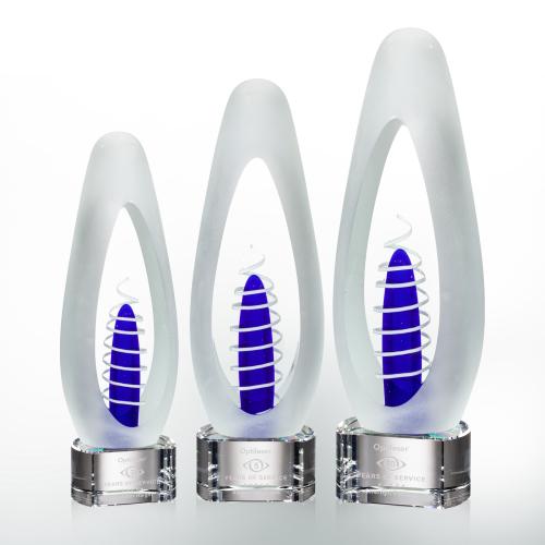 Of the Art Glass Awards, this beautiful Aspetti Award - Clear is a great choice. (ARG5261-C) A tall egg-shaped frosted art glass with sheared polished sides creating a window into the sapphire center encompassed by a strip of swirling ivory. Each piece is individually Hand-crafted and no two pieces are identical All sizes are approximate and will vary from piece to piece