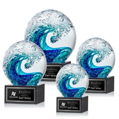 Of the Art Glass Awards, this beautiful Surfside Award on Square Marble is a great choice. (ARG2061-MS) The magnificent Surfside Artglass award features a beautiful crashing blue wave embedded in a perfect sphere. Deep turquoise and sapphire interact with air bubbles to create a powerful and striking display to honor your achievement. Each art glass piece is unique and one-of-a-kind! All sizes are approximate and will vary from piece to piece. Mounted on a black square marble base and personalized with a laser engraved plate.