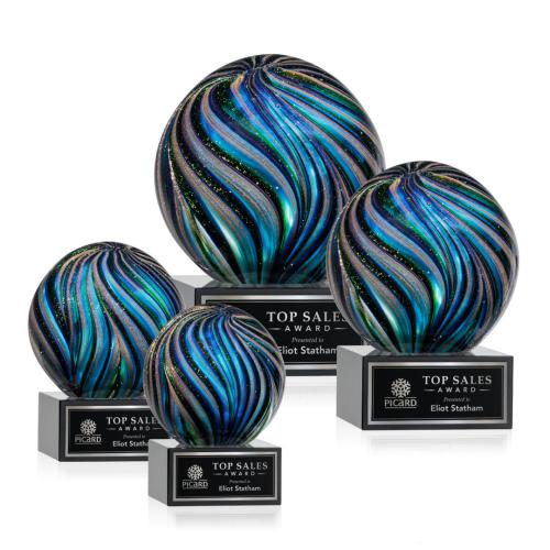 Of the Art Glass Awards, this beautiful Malton Award on Hancock Base - Black is a great choice. (ARG2231-HK) The Malton Award on Hancock Base is a stunning hand-blown work of art, complete with a complimenting base for personalization with a logo or name. This sparkling award features swirls of iridescent gold, ebony, sapphire, and emerald, perfect for recognizing a special achievement. Each piece is individually Hand-crafted and no two pieces are identical.
