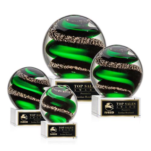 Of the Art Glass Awards, this beautiful Zodiac Award on Hancock Base - Clear is a great choice. (ARG2201-HC) Magnificent Striking Zodiac Art Glass Award features twisting ribbons of emerald and glimmering black speckles. Mounted on an Optical Crystal Paragon base in clear, green or black. Each piece is individually handcrafted and no two pieces are identical.