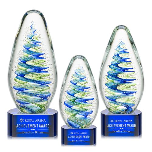 Of the Art Glass Awards, this beautiful Jezebel Award on Paragon Base - Blue is a great choice. (ARG4071-PL) Elevate your recognition with our breathtaking blue and green swirl design art glass award, a stunning masterpiece hand-blown to perfection. Accompanied by your choice of base for personalized engraving with a logo or name, each piece embodies individuality and craftsmanship. Individually hand-crafted, no two awards are alike, ensuring a unique and captivating symbol of achievement for any recipient.