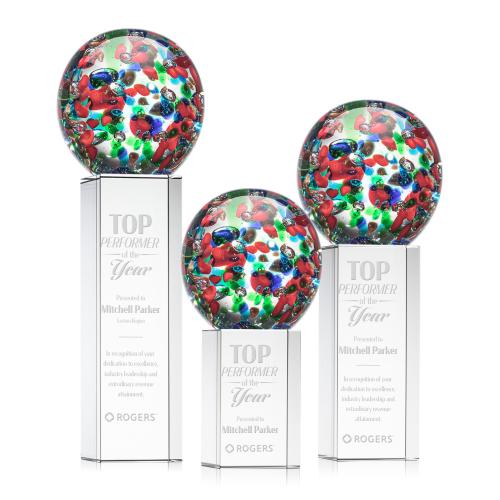 Of the Art Glass Awards, this beautiful Fantasia Award on Dakota Base is a great choice. (ARG2022-DK1) The Fantasia Award is a spectacular hand-blown work of art. A perfect sphere of abstract vibrant colors to dazzle the eye. Mounted on our tall Optical Dakota base. Each piece is individually handcrafted and no two pieces are identical.