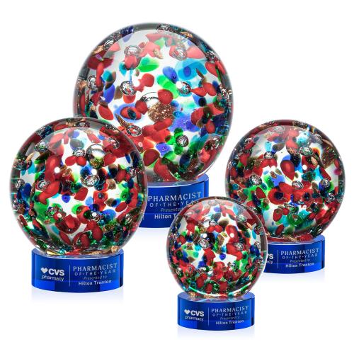 Of the Art Glass Awards, this beautiful Fantasia Award on Stanrich Base - Blue is a great choice. (ARG2021-SL) The Fantasia Award is a spectacular hand-blown work of art. A perfect sphere of abstract vibrant colors to dazzle the eye. Mounted on our Optical Stanrich base. Each piece is individually handcrafted and no two pieces are identical.