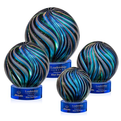Of the Art Glass Awards, this beautiful Malton Award on Stanrich Base - Blue is a great choice. (ARG2231-SL) The Malton Award on Colverstone Base is a stunning hand-blown work of art, complete with a complimenting base for personalization with a logo or name. This sparkling award features swirls of iridescent gold, ebony, sapphire, and emerald, perfect for recognizing a special achievement. Each piece is individually Hand-crafted and no two pieces are identical.