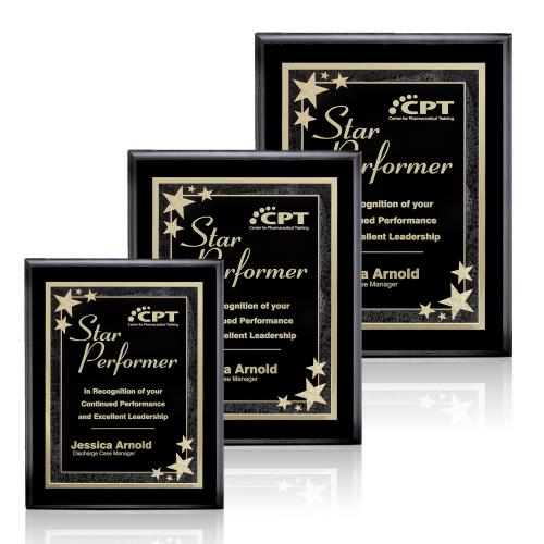 Celebrate exceptional achievements with the elegant Farnsworth/Starburst Black/Black plaque, an epitome of sophistication. This exemplary piece, featuring a lustrous black wood finish, is complemented by a solid brass plate that adds a touch of refined luxury. Available in three distinct sizes, it offers versatile options to suit various recognitions. The starburst motif embellishing the background illuminates the plaque, enhancing the engraved personalization that shines against the brushed brass. Ideal for honoring star performers, this plaque is a timeless choice for commemorating milestones and expressing gratitude with a lasting impression. Make your accolades truly memorable with this stunning award.