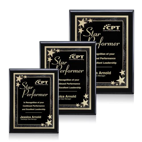 Add sophistication and elegance to your recognition program with the Oakleigh/Starburst award series in stunning black-on-black. These awards, available in three distinct sizes, are ideal for acknowledging varying levels of achievement or for honoring a progression of contributions. The high-gloss piano finish backing enhances the deep contrast of laser-engraved personalization, making the recipient's name and accolades strikingly prominent. Whether celebrating an individual's stellar performance, leadership excellence, or a significant milestone, this classic yet contemporary award serves as a memorable keepsake for any occasion. Each piece from the collection offers a timeless gesture of appreciation that is sure to be proudly displayed.