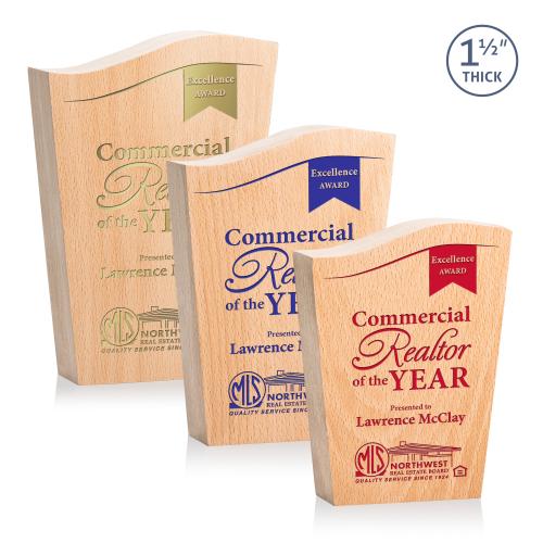 Of the Sustainable Awards, this beautiful Woburn Award is a great choice. (AWDC6631) The **1.5" thick** freestanding Woburn Award is a stunning tribute to excellence that combines the warmth of natural beechwood with a modern and artistic design. This award stands out with its unique contoured wave top, adding a touch of fluidity and sophistication to the traditional recognition piece.