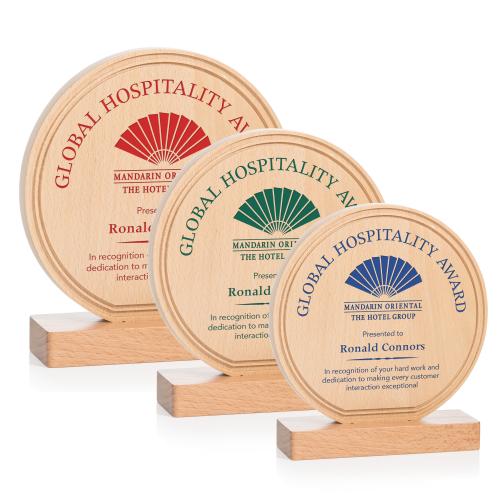 Of the Sustainable Awards, this beautiful Mulock Award is a great choice. (AWDC6731) The Mulock Award is an elegant Beechwood circle award with lined grooves along the edge, adding a refined touch to its sleek, modern design. Mounted on a matching beechwood base, it offers a sophisticated display for recognition or achievement.