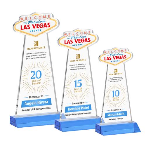 Of the Between $80 and $150, this beautiful Las Vegas VividPrint™ Award - Sky Blue is a great choice. (AWV4271-S) What happens in Vegas deserves to be celebrated in style. The Las Vegas VividPrint Award is crafted from premium starfire crystal, featuring an iconic Las Vegas sign cutout at the top with a vibrant printed design included. Mounted on a front-mitered crystal base, this striking piece is perfect for recognizing standout achievements and unforgettable milestones.