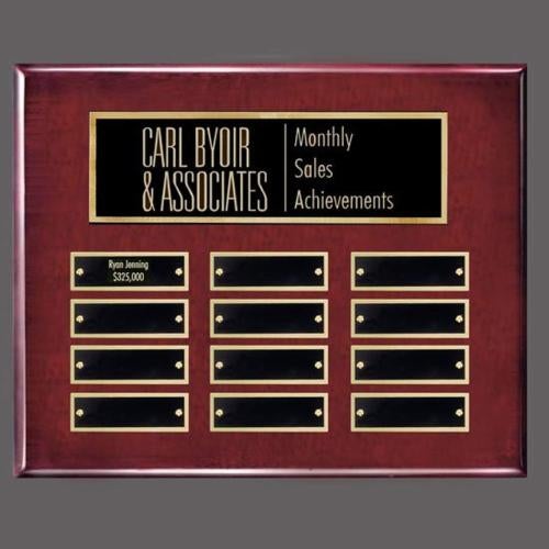 Of the Employee of the Month, this beautiful Oakleigh Horiz Pert/Plaque - Rosewood/Gold is a great choice. (APP2812-RG) High-Gloss Piano Finish Rosewood or Black 6 Sizes to choose from *Perpetual Plaques include a decorated Header Plate. Perpetual Plaque Plates shipped Blank and Attached. *For Personalized Perpetual Plates, additional setup and run charges apply.