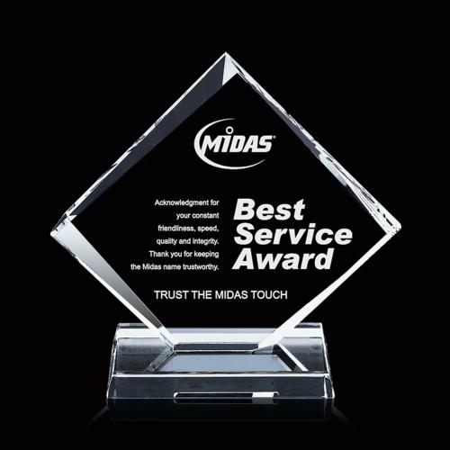 Of the Crystal Awards, this beautiful Regal Award - Starfire is a great choice. (PG401S) The 9" high, Starfire glass Regal features a four-sided diamond-shaped configuration with tapered bevels alternating front and back. The prominent, asymmetric and flaring bevels accentuate the sparkle of the glass, generate diverse and attractive reflections along the edges, and frame the large central etching area. Also available in 6" and 7.5" versions and in jade glass.