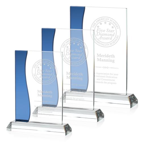 Of the Crystal Awards, this beautiful Landfield Award - Blue is a great choice. (AWS7605) Rectangular starfire crystal is layered with a blue accent, then mounted to a beveled starfire base, creating this formal award with contemporary flair.