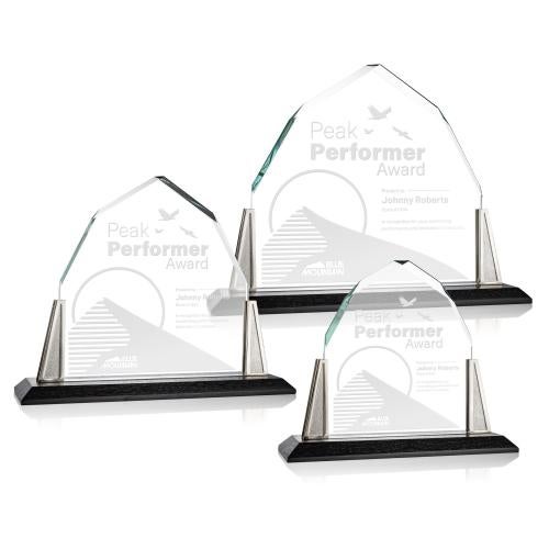 Of the Crystal Awards, this beautiful Avalon Award - Pewter is a great choice. (AWS4301-P) The Avalon Award is beautifully crafted from premium Starfire crystal, featuring a distinctive peaked silhouette that delivers exceptional clarity and brilliance. Accented with striking pewter angle posts that frame the design with a refined, contemporary touch, it creates a bold and elegant presentation. Mounted on a sleek black base for added stability and contrast, this award is also available with gold posts for a warmer finish.