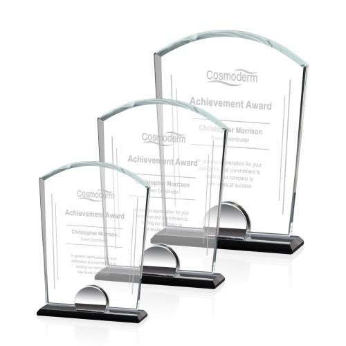 Of the Crystal Awards, this beautiful Spencer Award is a great choice. (AWS2381) The rounded panel of the Spencer Starfire award has a classic look that exudes honor and pride. Features a chrome finished accent mounted on a black bevelled base.