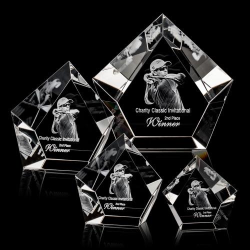 Of the Crystal Awards, this beautiful Valecrest Award - 3D is a great choice. (OPD330) This pentagon award creates reflections of your 3D image, rippled along its many bevels, symbolizing the greatness of the achievement as it reflects a remnant image through every inch of the piece. **Our 3D Pop process creates a simulated 3D effect from a 2D photo. For a true 3D engraving, please provide a 3D engraving file (.obj), or we can redraw it for a fee.**
