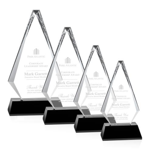 Of the Crystal Awards, this beautiful Arcadia Award is a great choice. (OPT1901-K) The optical crystal diamond of the Arcadia is precisely beveled with intersecting angles, then mounted to a black beveled optical crystal base to reflect brilliant bevels throughout the polished surface.