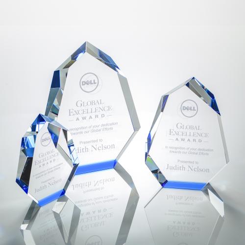 Of the Crystal Awards, this beautiful Norwood Award - Blue is a great choice. (OPT4851-L) The multifaceted interchanging bevels of the Optical Norwood Award refract a sapphire base creating a dazzling display of blue reflections. This thick freestanding work of recognition art makes a bold statement when awarded to a deserving recipient.