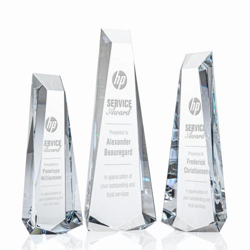 Of the Crystal Awards, this beautiful Rustern Obelisk Award is a great choice. (OPT1271) The Rustern Obelisk is a modern monument to optical crystal brilliance. With a sharp multifaceted base that continues through the beveled sides and top, this sparkling recognition sculpture is a sight to behold. Available in freestanding or with a clear or colored optical crystal base.