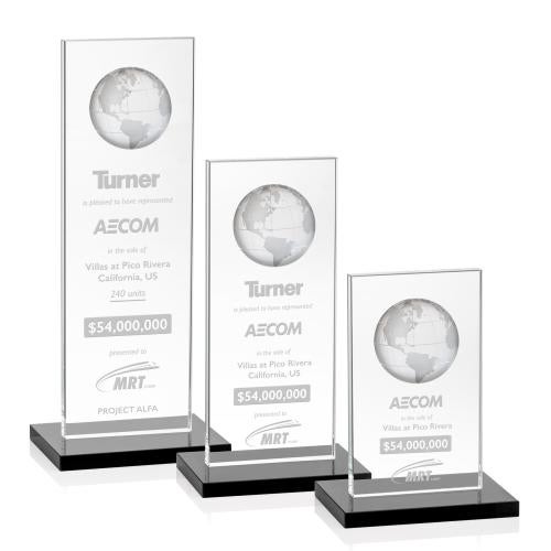 Of the Crystal Awards, this beautiful Brannigan Globe Award - Black is a great choice. (OPG5861-K) Our Brannigan Globe Award features a 2" flat optical dome perched atop a tall crystal pane with a large decorating area to commemorate your exceptional achievement. Available with your choice of clear or colored base.