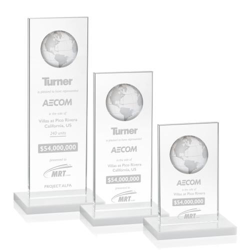 Of the Crystal Awards, this beautiful Brannigan Globe Award - White is a great choice. (OPG5861-W) Our Brannigan Globe Award features a 2" flat optical dome perched atop a tall crystal pane with a large decorating area to commemorate your exceptional achievement. Available with your choice of clear or colored base.