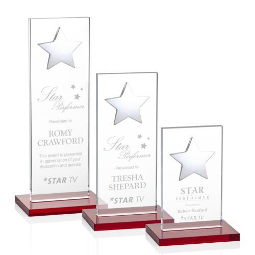 Of the Crystal Awards, this beautiful Dallas Star Award - Red/Silver is a great choice. (OPS5861-SR) This illustrious Starfire Crystal award stands upright on an elegant Ruby base and is adorned with a Silver star for optimal view. The perfect recognition piece for a star performer. Also available with Gold star.