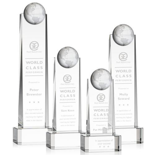 Of the Crystal Awards, this beautiful Sherbourne Globe Award on Base - Clear is a great choice. (OPG361-C) Wonderful tall optical piece on a Clear Optical base with a 3D Globe mounted on the front. A statuesque piece to recognize a global trailblazer.