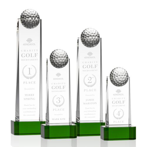 Of the Crystal Awards, this beautiful Dunbar Golf Award on Base - Green is a great choice. (GLF750-G) The monumental Dunbar Golf Award features a sparkling domed golf ball perched on top of the magnificent accolade. With a glistening Green base, this award is perfect to recognize a champion performance.