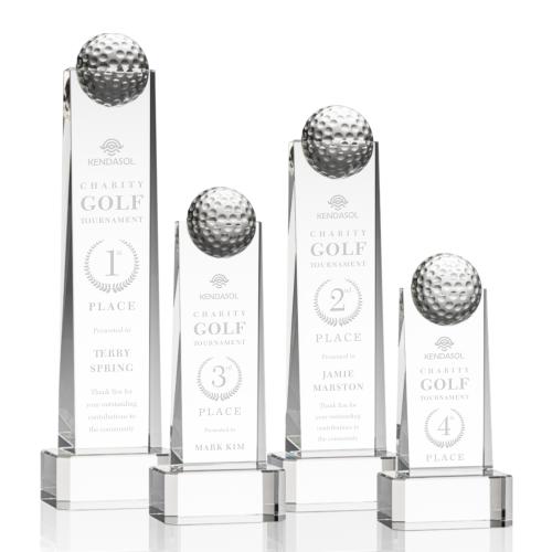 Of the Crystal Awards, this beautiful Dunbar Golf Award on Base - Clear is a great choice. (GLF750-C) The monumental Dunbar Golf Award features a sparkling domed golf ball perched on top of the magnificent accolade. With a glistening Clear base, this award is perfect to recognize a champion performance.