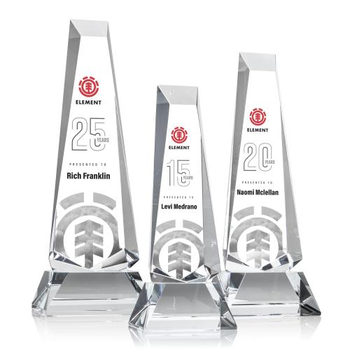 Of the Crystal Awards, this beautiful Rustern Obelisk VividPrint™ Award on Base - Clear is a great choice. (OPV1271-C) The Rustern Obelisk is a modern monument to optical crystal brilliance. With a sharp multifaceted base that continues through the beveled sides and top, this sparkling recognition sculpture is a sight to behold. Available in freestanding or with a clear or colored optical crystal base. Let your message POP with full color VividPrint!