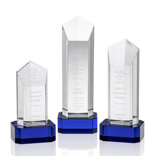 Of the Crystal Awards, this beautiful Jolanda Award on Base - Blue is a great choice. (OPT2611-CL) The Jolanda Award is a solid Optical Crystal pentagon tower with dramatic slant. With an elegant Blue base, this award is perfect for recognizing excellence. Second position etch optional.