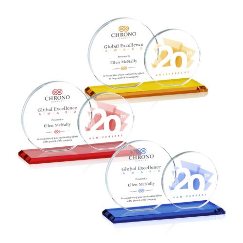 Of the Crystal Awards, this beautiful Double Victoria VividPrint™ Award is a great choice. (AWV316) The Double Victoria Award features 2 opulent Starfire circles positioned on a dazzling Emerald Green, Sapphire Blue, Amber, Ebony, Ruby, White glass panel or albion base. Let your message POP with full color VividPrint!