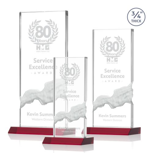 Of the Crystal Awards, this beautiful Poole Award - Red is a great choice. (AWS3231-R) The striking Starfire Crystal Poole Award features a .75" thick Vertical Upright with a deep carved cascading waterfall effect sculpted right into the award. Mounted on an Ruby Red polished front mitered base, these unique awards add a contemporary twist to traditional corporate recognition. 2nd Position Etch Optional.
