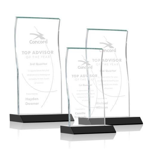 Of the Crystal Awards, this beautiful Edmonton Award - Black is a great choice. (AWS2041-K) Tall Vertical 0.5" thick Starfire Crystal Tower that elegantly curves and arches near the top to create a striking recognition piece to highlight your momentous achievement. Available in 3 sizes and 8 distinct front mitered Colored Crystal Bases.