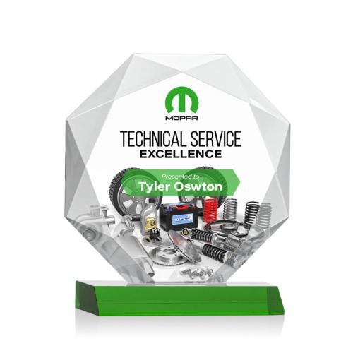 Of the Crystal Awards, this beautiful Kitchener VividPrint™ Award - Green is a great choice. (AWV2441-G) Striking Starfire Octagon award refracts light through all of its facets creating a brilliant display for achievement recognition. Available in 3 sizes and 9 different colored bases. Let your message POP with full color VividPrint! Second Position Etch & Colorfill optional.