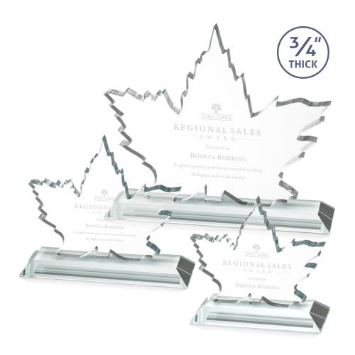 Of the Crystal Awards, this beautiful Maple Leaf Award - Starfire is a great choice. (AWS0801) Stunning Starfire Crystal formed into a beautiful maple leaf with acid polished edges and mounted on top of a Clear mitered base. A great symbol of Strength, Perseverance and Canadian Pride. Let your message POP with full color VividPrint.