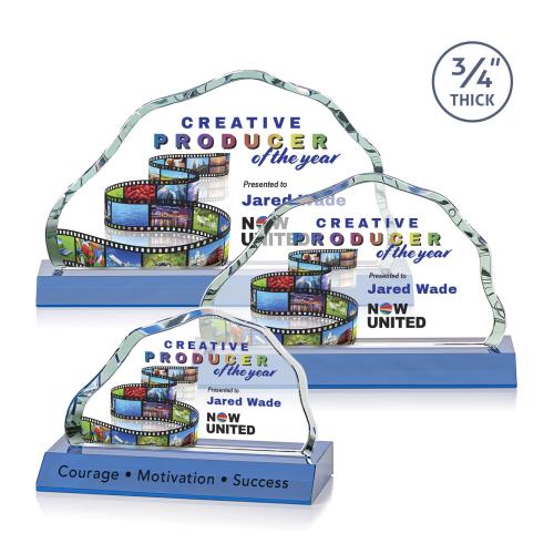 Of the Crystal Awards, this beautiful Highbridge VividPrint™ Award - Sky Blue is a great choice. (AWV2471-S) The Starfire Crystal Highbridge VividPrint Award is a magnificent .75" thick beveled iceberg that forms an incredible frame for your mountainous achievement. The colored crystal base refracts through the edges of the award for a dazzling show of sky blue reflections. 2nd Position Etch Optional.
