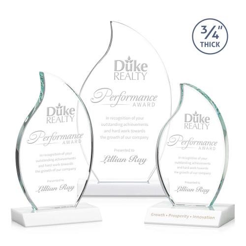 Of the Crystal Awards, this beautiful Croydon Flame Award - White is a great choice. (AWS1741-W) The Croydon award features an elegant 3/4" thick Starfire Crystal flame to commemorate your achievement with an eternal symbol of greatness. Mounted on your choice of 8 sparkling colored bases. Second position etch optional.