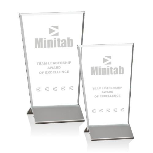 Of the Crystal Awards, this beautiful Kaven Award - Aluminum is a great choice. (AWS8682) The Kavan is one of a family of four narrow-beveled, .25" thick starfire glass uprights slotted into pleated aluminum bases, a light weight combination with a large etching area. In the 6" high Kavan, the upright is gently flared and straight-topped. Also available in an 8" version.