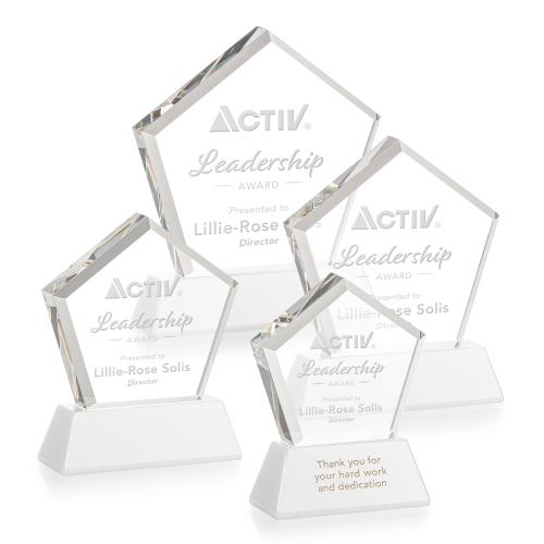 Of the Crystal Awards, this beautiful Genosee Award on Base - White is a great choice. (OPT6112-W) The Genosee Award on Base features a sparkling faceted extra-thick Optical Crystal pentagon mounted on your choice of 8 distinct tall tapered bases. Second Position Etch & Colorfill Optional. A brilliant award to recognize an exceptional performance.
